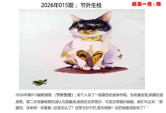 2026年第015幽默猜测(节外生枝);有个人买了一瓶黑色的液体伟哥。怕老婆发现,就藏在厨房里。第二天老婆做菜时误认为是酱油,就到在豆芽里抄,可是豆芽越抄越硬。她忙叫丈夫:“亲爱的,快来呀!你看看~这是怎么了?豆芽甘抄不烂,是为啥啊!还把锅盖顶起来了?”
